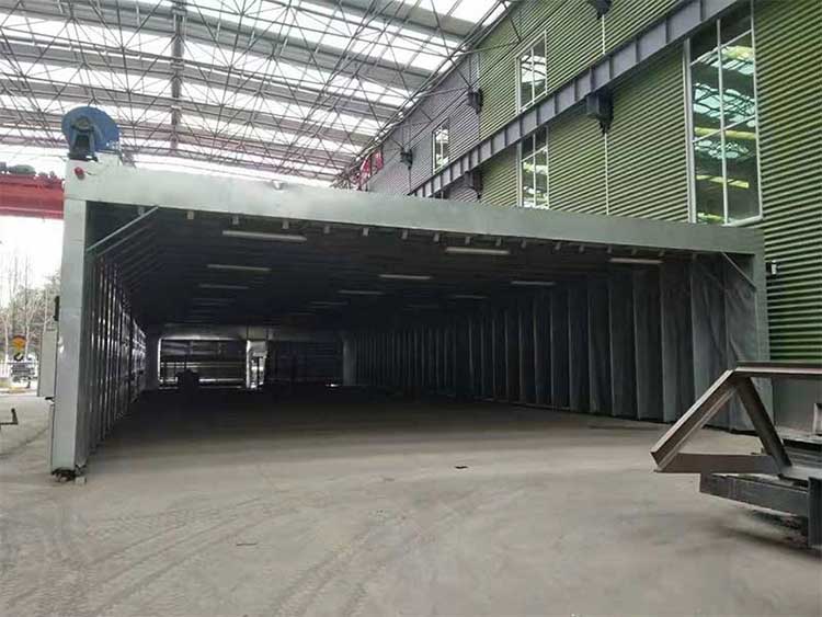 1、移動伸縮噴漆房,因為鋼管的工件比較長,為了方便工件的運轉(zhuǎn),提高生產(chǎn)效率,以及有效的收集漆霧顆粒,故需要一臺長24米,寬6米,高4米的移動伸縮噴漆房。移動噴漆房框架使用鍍鋅方管制作,移動伸縮房蓬布使用三防布制作,內(nèi)部設(shè)有防爆炸照明裝置,佑泰環(huán)保制作的移動伸縮噴漆房,使用機器人焊接,安裝后外觀美麗大方,結(jié)實耐用。