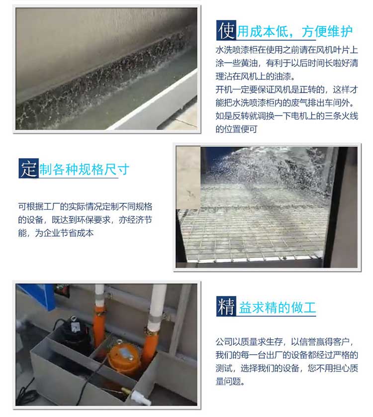 水簾柜是處理噴漆霧的一種廢氣處理設(shè)備。它的作業(yè)原理是將噴漆過程中噴槍噴出來的廢氣俗稱漆霧約束在必定的區(qū)域內(nèi)進(jìn)行過濾。再經(jīng)過吸水泵循環(huán)將水箱內(nèi)的水抽至上部水槽,由水槽溢流至水簾板,經(jīng)過水簾板構(gòu)成水簾  ,同時(shí)使用高速氣流所發(fā)生的沖擊效果,經(jīng)旋流板將水卷起來使水霧化來洗刷空氣,凈化漆霧,經(jīng)擋水板則將空氣中的水霧阻撓下來,處理后的空氣經(jīng)過風(fēng)機(jī)與排風(fēng)管道排出車間外面,能夠使操作者在契合國(guó)家衛(wèi)生條件和安全標(biāo)準(zhǔn)的作業(yè)環(huán)境中作業(yè),然后促進(jìn)企業(yè)出產(chǎn)功率更高。