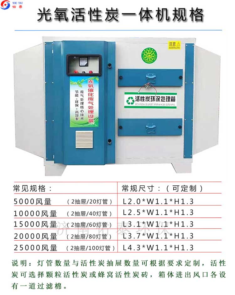 四、佑泰環(huán)保光氧活性炭一體機(jī)配置如下:(活性炭抽屜數(shù)與光氧燈管數(shù)可以按要求增減)
