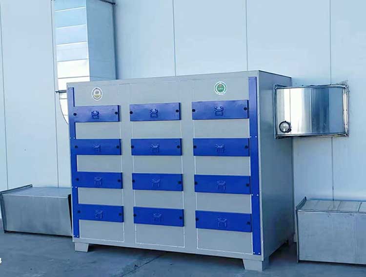 二層為活性炭吸附,活性炭具有合理的孔隙結(jié)構(gòu),良好的吸附性能,機(jī)械強(qiáng)度高,易反復(fù)再生,造價(jià)低等特點(diǎn);用于有毒氣體的凈化,廢氣處理,工業(yè)和生活用水的凈化處理,溶劑回收等方面。活性炭在運(yùn)輸過程中,防止與堅(jiān)硬物質(zhì)混狀,不可踩、踏,以防炭粒破碎,影響質(zhì)量。亦要防止水浸,因水浸后,大量水充滿活性空隙,使其失去作用。另外避免焦油類物質(zhì)帶入活性炭床,以免堵塞活性炭空隙,使其失去吸附作用。