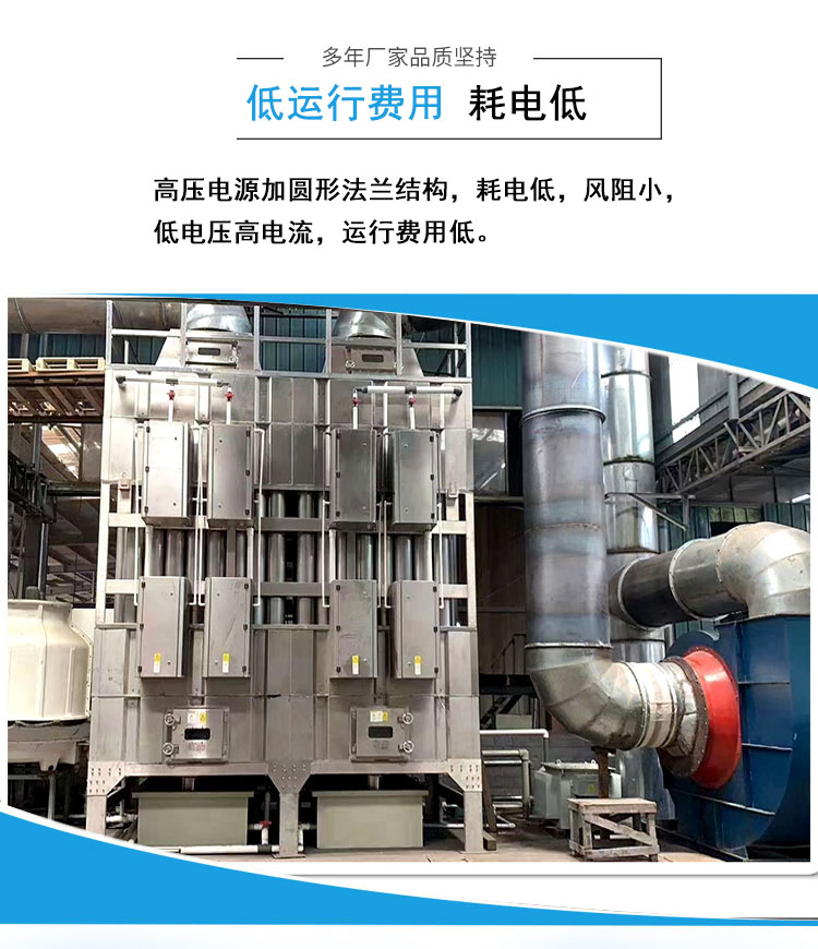 5.低運(yùn)行費(fèi)用:高壓電源加圓形法蘭結(jié)構(gòu),耗電低,風(fēng)阻小,低電壓高電流,運(yùn)行費(fèi)用低。