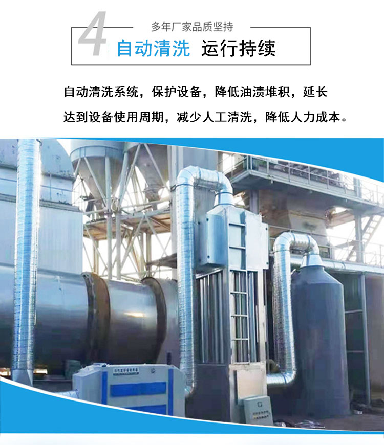1.采用創(chuàng)新性的噴淋和多層高壓靜電場一體化混合設(shè)計(jì),除塵、除油煙、降溫、滅火效果優(yōu)異,沒有滴油、堵塞、燃燒的現(xiàn)象發(fā)生。