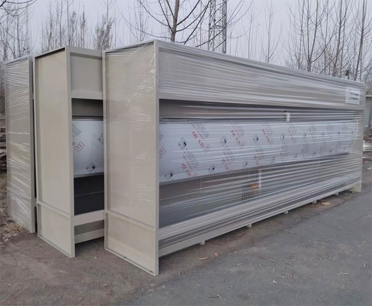 L5.0*W0.9*H2.1(m),面板1.0厚鍍鋅板噴塑,水池1.5mm鍍鋅板噴塑。水簾201不銹鋼。一層噴淋,一層浮球。電控箱一個(gè)。水泵一個(gè),風(fēng)機(jī)4臺(tái)。