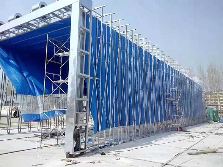 3、伸縮移動(dòng)噴漆房整體為框架傳動(dòng)結(jié)構(gòu),每組框架間均有阻燃PVC布密封連接,安裝快捷、外形美觀,結(jié)構(gòu)精巧,使用方便,制造成本低,節(jié)約投資;