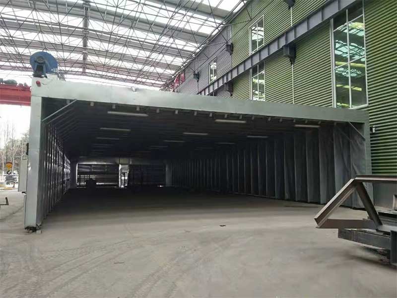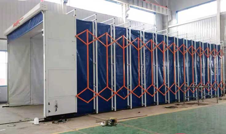 2.1、 伸縮移動噴漆房:是由框架主體、阻燃PVC布、防爆照明等形成的半封閉空間,和廢氣凈休設備一起形成涂裝作業(yè)的工作場合。